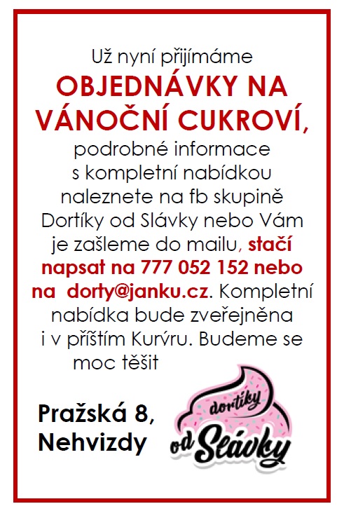 Dortíky od Slávky nabízejí vánoční cukroví, které si můžete objednat na dorty@janku.cz nebo na telefonu 777 052 152. Kompletní nabídku naleznete na fb skupině Dortíky od Slávky.